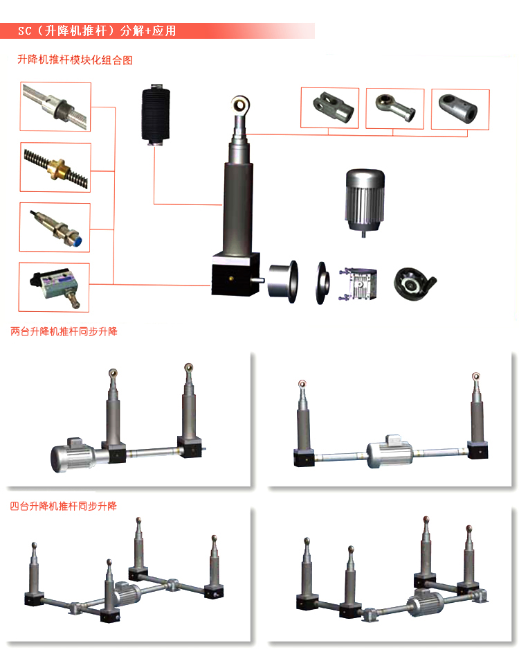 SCb/SCA系列升降機推桿,力姆泰克公司推出全新系列SCB/SCA系列升降機推桿,對于重型載荷的直線運動提供了全新的成熟解決方案,將螺旋升降機推桿/電機/減速電機等附件模塊化有機組合一起,實現工業領域的重載提升橫移運動,同事高密封的防護等級更適合在惡劣的工作環境中正常工作,是替代液壓減少環境污染,節約能源,減少維護成本的高性價比方案。多個升降機推桿同步升降,使用單電機驅動2-18個升降機推桿同步升降,可實現絕對同步,同步精度可至0.1mm,控制簡單,可靠性高,我們將提供成套升降系統方案設計,同時提供成套升降系統。